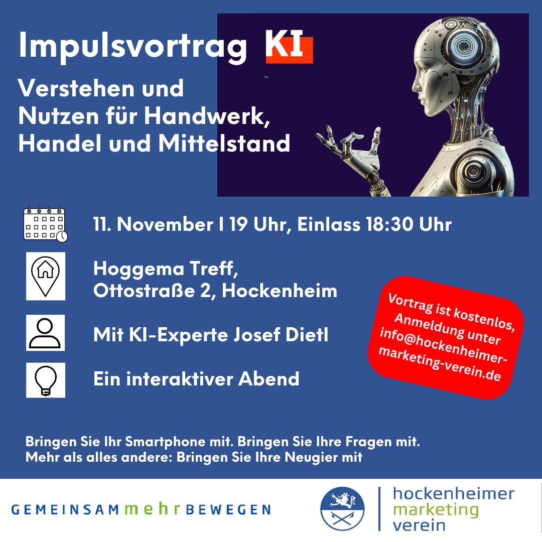 Am Dienstag, 11. November 2025, um 18:30 Uhr, lädt der Arbeitskreis MIG (Mehrwert für Industrie und Gewerbe) vom Hockenheimer Marketing Verein (HMV) in Kooperation mit dem Integrationsbüro zu einem außergewöhnlichen Impulsvortrag in den Hoggema Treff ein. Ein interaktiver Abend mit KI-Experte Josef Dietl, der zeigt, wie KI zum Werkzeug wird – für den eigenen Arbeitsplatz, das eigene Unternehmen, die eigene Zukunft.